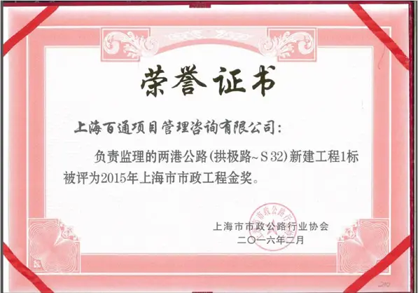 近日,上海市市政公路行業協會組織開展本市市政工程金獎評比工作。根據上海市市政工程金獎評定要求,從項目投資、工程質量、安全管理,社會影響等不同方面,堅持好中取優的原則,經評審委員會的慎重評審,共有二十六項工程被授予第二十一屆(2015年度)“上海市市政工程金獎”稱號。我司負責監理的兩港公路(拱極路~S32)新建工程有幸獲此殊榮。上海市市政工程金獎是上海市市政工程榮譽最高、含金量最大的獎項,這也是我司監理項目首次獲得市級市政工程金獎榮譽。