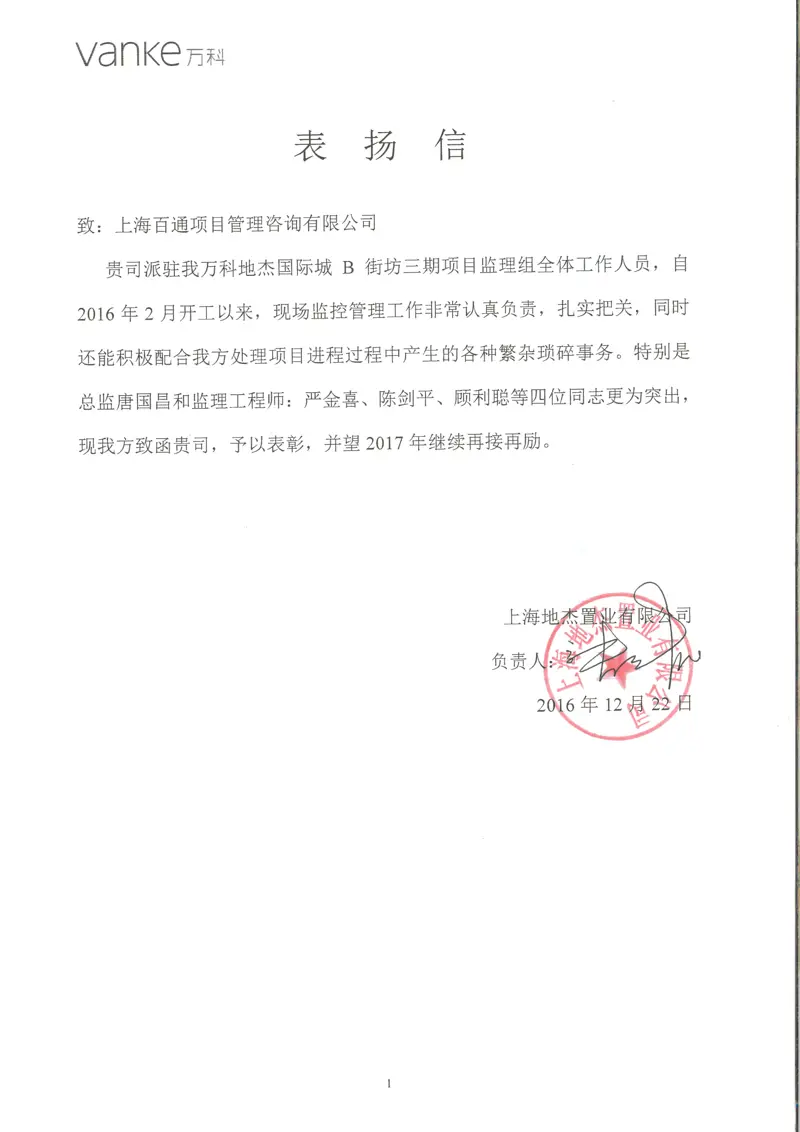 我司于2016年12月22日收到來自上海地杰置業有限公司(業主)的表揚信,信中業主表揚了萬科地杰國際城B街坊三期項目監理組全體工作人員,自2016年2月開工以來,現場監控管理工作非常認真負責,扎實把關,同時還能積極配合業主處理項目進程中產生的各種繁雜瑣碎事務。特別是總監唐國昌和監理工程師:嚴金喜、陳劍平、顧利聰等四位同志更為突出。希望該監理組在2017年再接再厲,踏實做好項目監理工作,也希望其他項目監理組成員以他們為榜樣,多向他們學習,把監理工作做得更好。