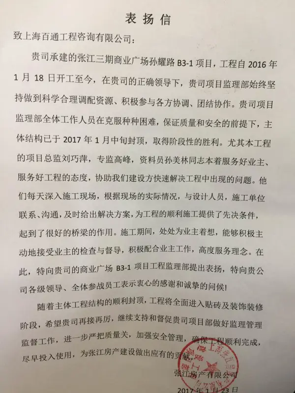 我司監理的張江三期商業廣場孫耀路B3-1項目監理部近日收到業主方表揚信。信中表揚了由劉巧萍總監帶領的監理項目部,自項目2016年1月開工以來,嚴格履行監理職責,強化監理服務意識,積極協調各方關系,及時解決工程中出現的問題,嚴把質量、安全兩道關,現場監理工作表現突出,成績顯著(尤其提到工作表現突出的總監劉巧萍、專監高峰、資料員孫美林三位同志),特向我司張江商業廣場B3-1項目監理部提出表揚。
