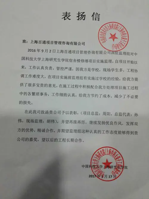監理分公司中國科技大學上海研究生院宿舍樓修繕項目監理機構,自項目開工以來,嚴格履行監理職責,工作認真負責,現場管控嚴謹,使現場質量、安全處于受控狀態。在造價控制方面,工作認真細致,嚴控工程變更,減少了不必要的損失,為業主在成本控制方面做出了成績,受到業主的嘉許。