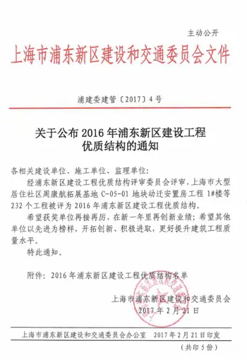 監理分公司項目張江三號動遷基地二期B5-1地塊配套商品房建設工程1#樓、3#樓、4#樓、5#樓、6#樓、7#樓、8#樓(7棟樓),經浦東新區建設工程優質結構評審委員會評審,被評為2016年浦東新區建設工程優質結構。