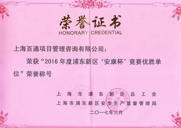 經浦東新區總工會、浦東新區安全生產監督管理局多輪檢查及評比,我司榮獲“2016年度浦東新區‘安康杯’競賽優勝單位”榮譽稱號。
