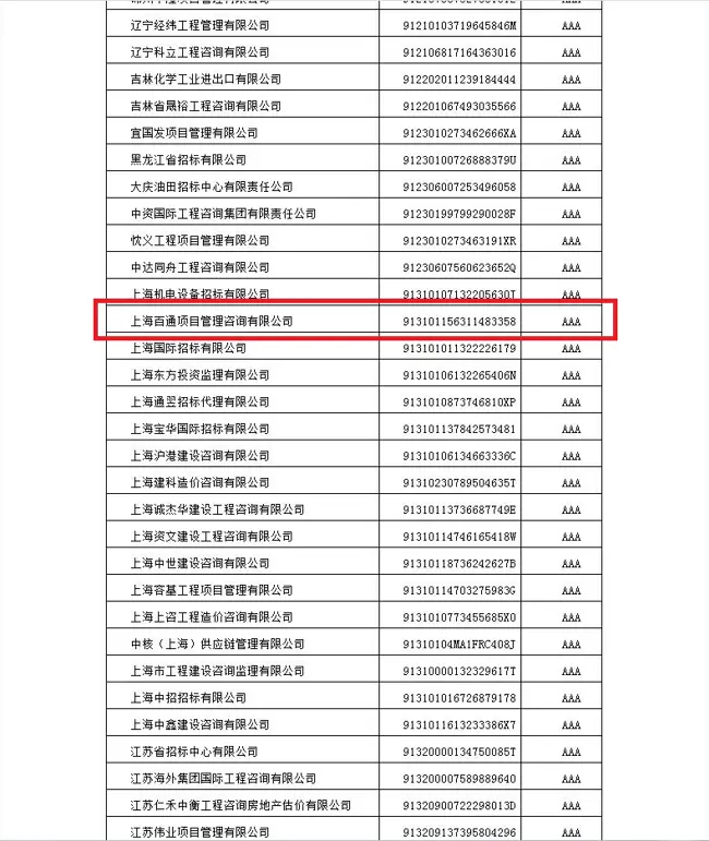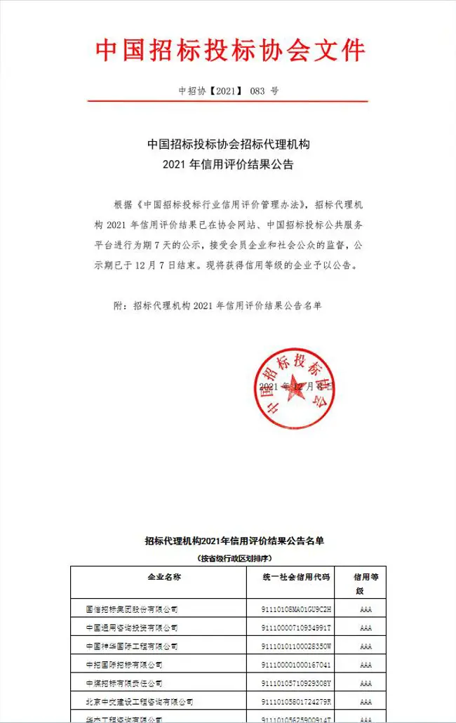 近日,根據《中國招標投標行業信用評價管理辦法》,我司獲評中國招標投標協會招標代理機構2021年信用評價等級AAA級。