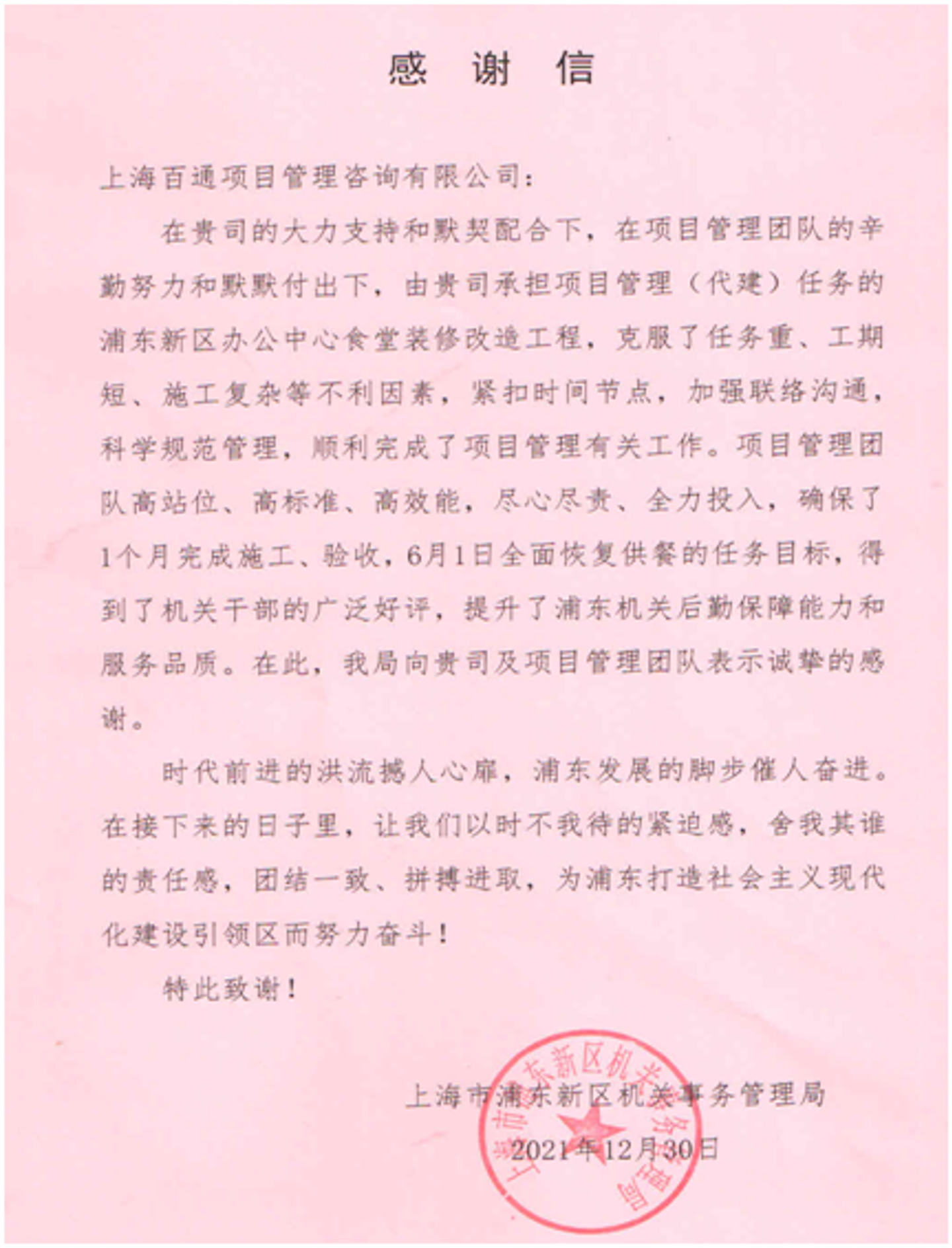 近日,我司收到上海市浦東新區(qū)機(jī)關(guān)事務(wù)管理局發(fā)來(lái)的感謝信,向我司項(xiàng)目管理團(tuán)隊(duì)在浦東新區(qū)辦公中心食堂裝修改造工程項(xiàng)目管理中高站位、高標(biāo)準(zhǔn)、高效能,盡心盡責(zé)、全力投入,克服任務(wù)重、工期短、施工復(fù)雜等困難,在一個(gè)月時(shí)間內(nèi)圓滿完成任務(wù)目標(biāo),提升浦東機(jī)關(guān)后勤保障能力和服務(wù)品質(zhì)表示誠(chéng)摯感謝。