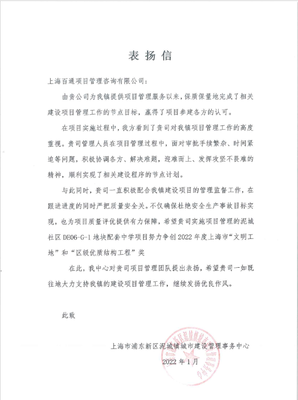 收到上海市浦東新區(qū)泥城鎮(zhèn)城市建設(shè)管理事務(wù)中心向項(xiàng)目管理團(tuán)隊(duì)發(fā)來(lái)的感謝信,感謝團(tuán)隊(duì)成員在項(xiàng)目管理過(guò)程中,面對(duì)審批手續(xù)繁雜、時(shí)間緊迫等問(wèn)題,積極協(xié)調(diào)各方,解決難題、迎難而上,發(fā)揮攻堅(jiān)不畏難的精神,順利實(shí)現(xiàn)了相關(guān)建設(shè)程序的節(jié)點(diǎn)計(jì)劃,保質(zhì)保量完成任務(wù),贏得了項(xiàng)目參建各方的認(rèn)可。