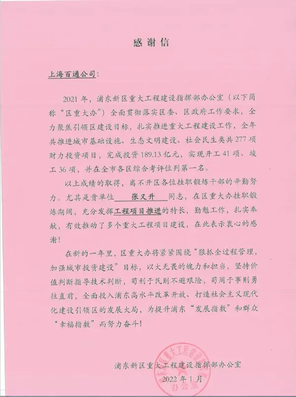 收到浦東新區(qū)重大工程建設(shè)指揮部辦公室向張又升同志發(fā)來(lái)的感謝信,感謝張又升同志在新區(qū)重大辦掛職鍛煉期間,充分發(fā)揮工程項(xiàng)目推進(jìn)的特長(zhǎng),勤勉工作、扎實(shí)奉獻(xiàn),有效推動(dòng)了多個(gè)重大工程項(xiàng)目建設(shè)。