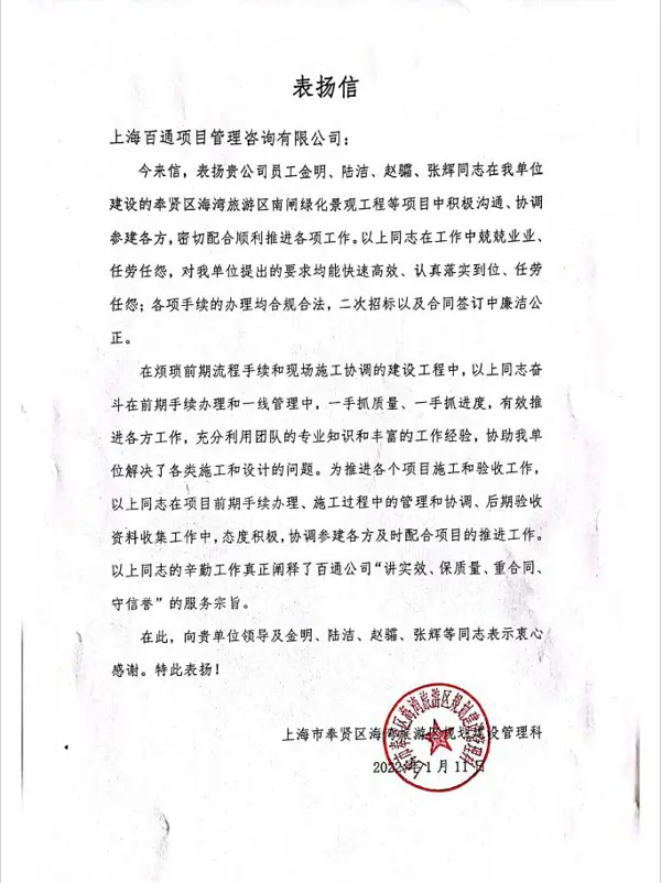 收到上海市奉賢區(qū)海灣旅游區(qū)規(guī)劃建設(shè)管理科向金明、陸潔、趙驦、張輝四位同志發(fā)來(lái)的感謝信,表?yè)P(yáng)四位同志在南閘綠化景觀工程等項(xiàng)目中積極溝通,協(xié)調(diào)參建各方,密切配合順利推進(jìn)各項(xiàng)工作,闡釋了我司“講實(shí)效、保質(zhì)量、重合同、守信譽(yù)”的服務(wù)宗旨。