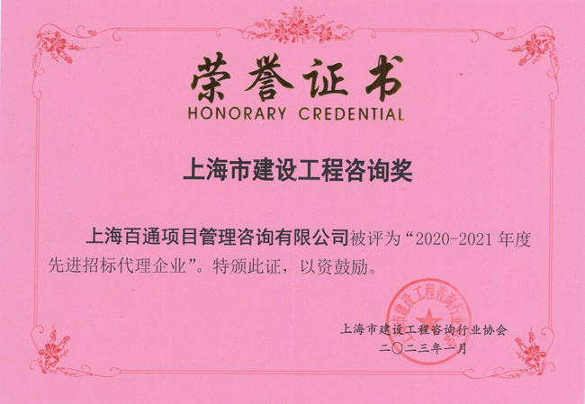 蟬聯(lián)上海市建設(shè)工程咨詢行業(yè)協(xié)會(huì)授予的2020-2021年度“先進(jìn)招標(biāo)代理企業(yè)”、“先進(jìn)造價(jià)咨詢企業(yè)”、“先進(jìn)工程監(jiān)理企業(yè)”稱號(hào)