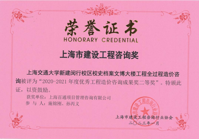 上海交通大學(xué)新建閔行校區(qū)校史檔案文博大樓工程全過程造價(jià)咨詢榮獲2020-2021年度“優(yōu)秀工程造價(jià)咨詢成果獎(jiǎng)二等獎(jiǎng)”