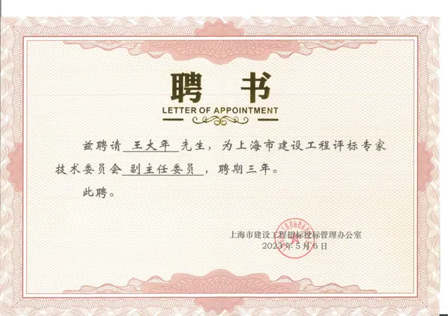 2023年5月6日下午,上海市建筑建材業(yè)市場管理總站舉行了上海市建筑工程評標(biāo)專家技術(shù)委員會委員聘任會暨第一次會議,總站馬燕站長宣讀了上海市建設(shè)工程評標(biāo)專家技術(shù)委員會成員名單,由同濟(jì)大學(xué)呂西林院士領(lǐng)銜以及36名成員組成。我司王大年董事長受聘為副主任委員兼經(jīng)濟(jì)分會委員,并作了交流發(fā)言。市住建委裴曉副主任參加會議并作了重要講話。