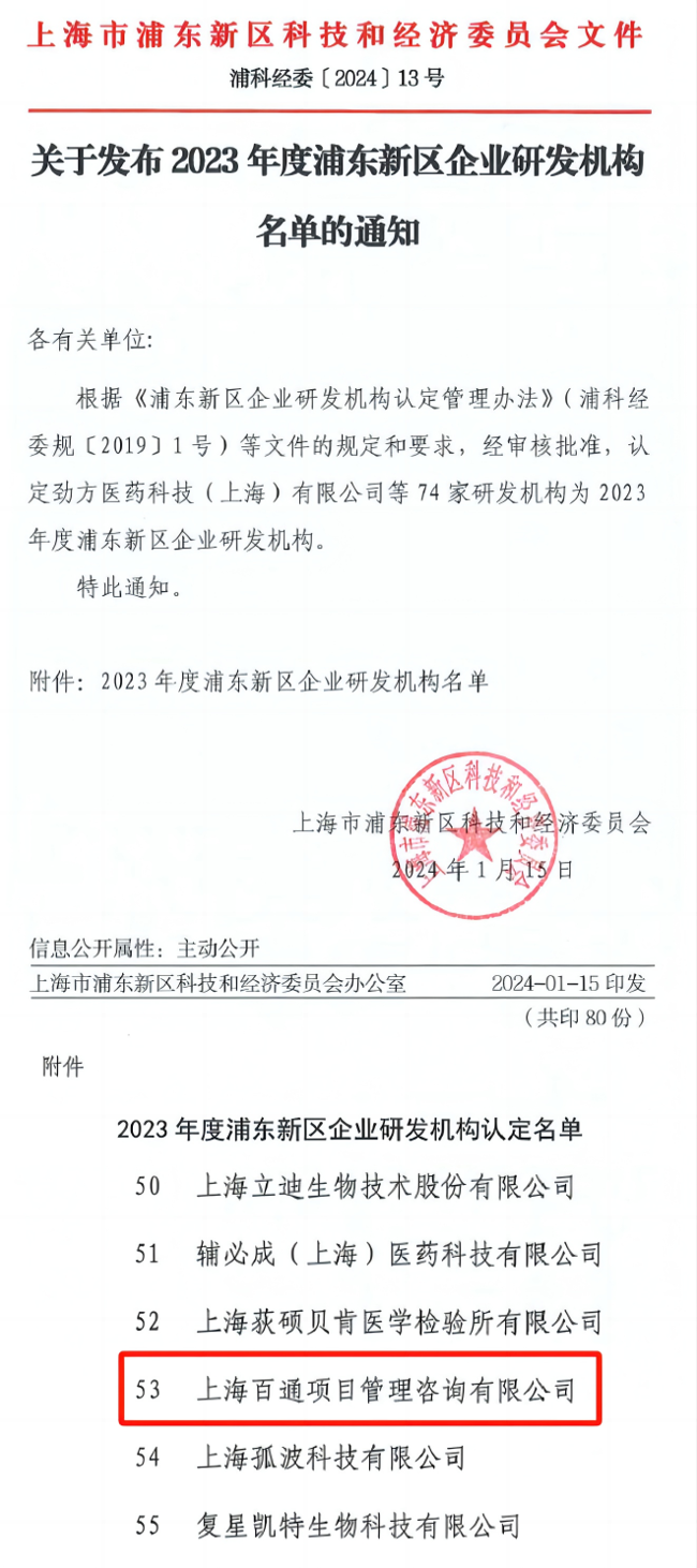 根據(jù)《浦東新區(qū)企業(yè)研發(fā)機構(gòu)認定管理辦法》(浦科經(jīng)委規(guī)〔2019〕1號),經(jīng)浦東新區(qū)科經(jīng)委的專家評審和綜合評估,百通公司成功認定