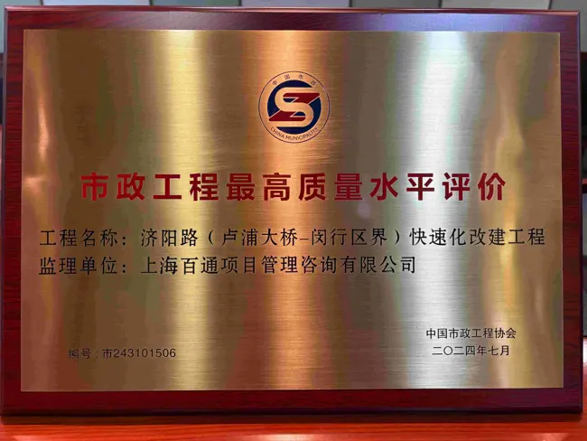 近日,我司收到中國市政工程協(xié)會(huì)頒發(fā)的榮譽(yù)證書,表彰我司監(jiān)理的濟(jì)陽路(盧浦大橋至閔行區(qū)界)快速化改建工程榮獲“2024年市政工程最高質(zhì)量水平評價(jià)”獎(jiǎng)。此獎(jiǎng)項(xiàng)是百通監(jiān)理斬獲的又一國家級榮譽(yù),這不僅是對我司監(jiān)理高質(zhì)量服務(wù)的肯定,也標(biāo)志著在市政工程領(lǐng)域的技術(shù)水平和管理能力再上新臺(tái)階。