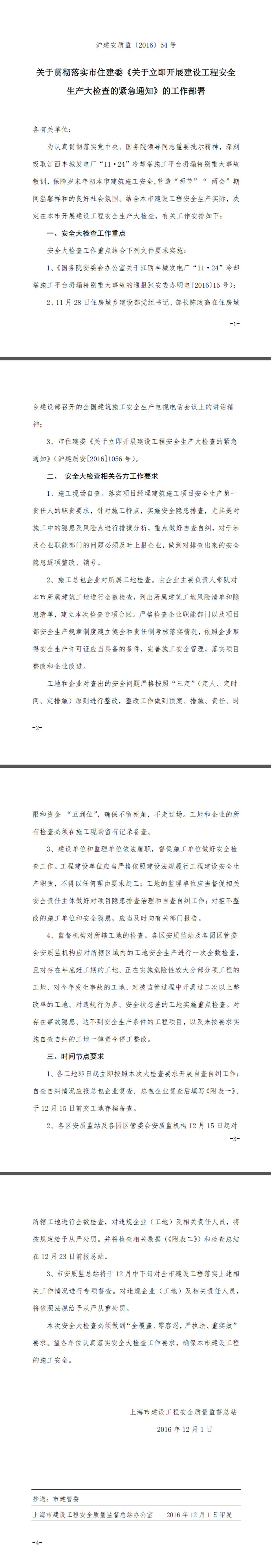 关于贯彻落实市住建委《关于立即开展建设工程安全生产大检查的紧急通知》的工作部署【沪建安质监(2016)54号】
