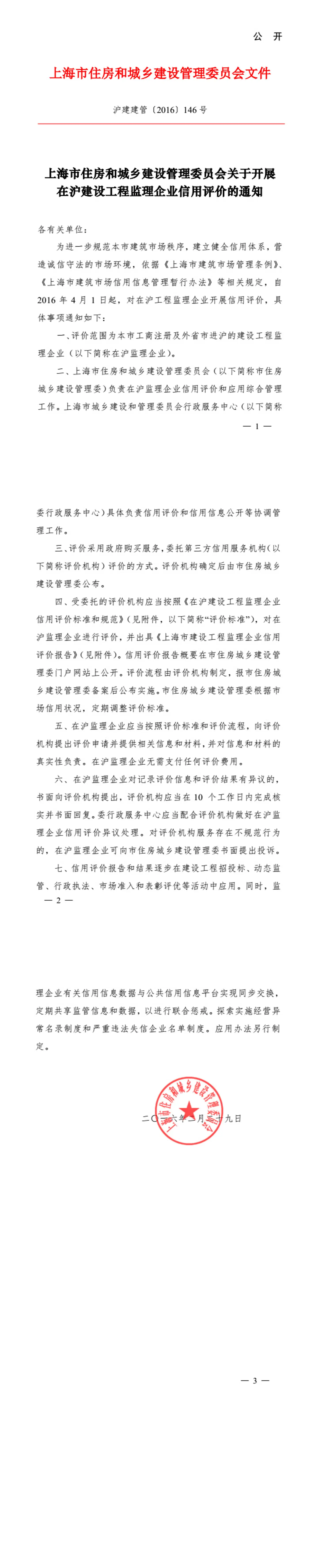 关于开展在沪建设工程监理企业信用评价的通知(沪建建管[2016]146号)