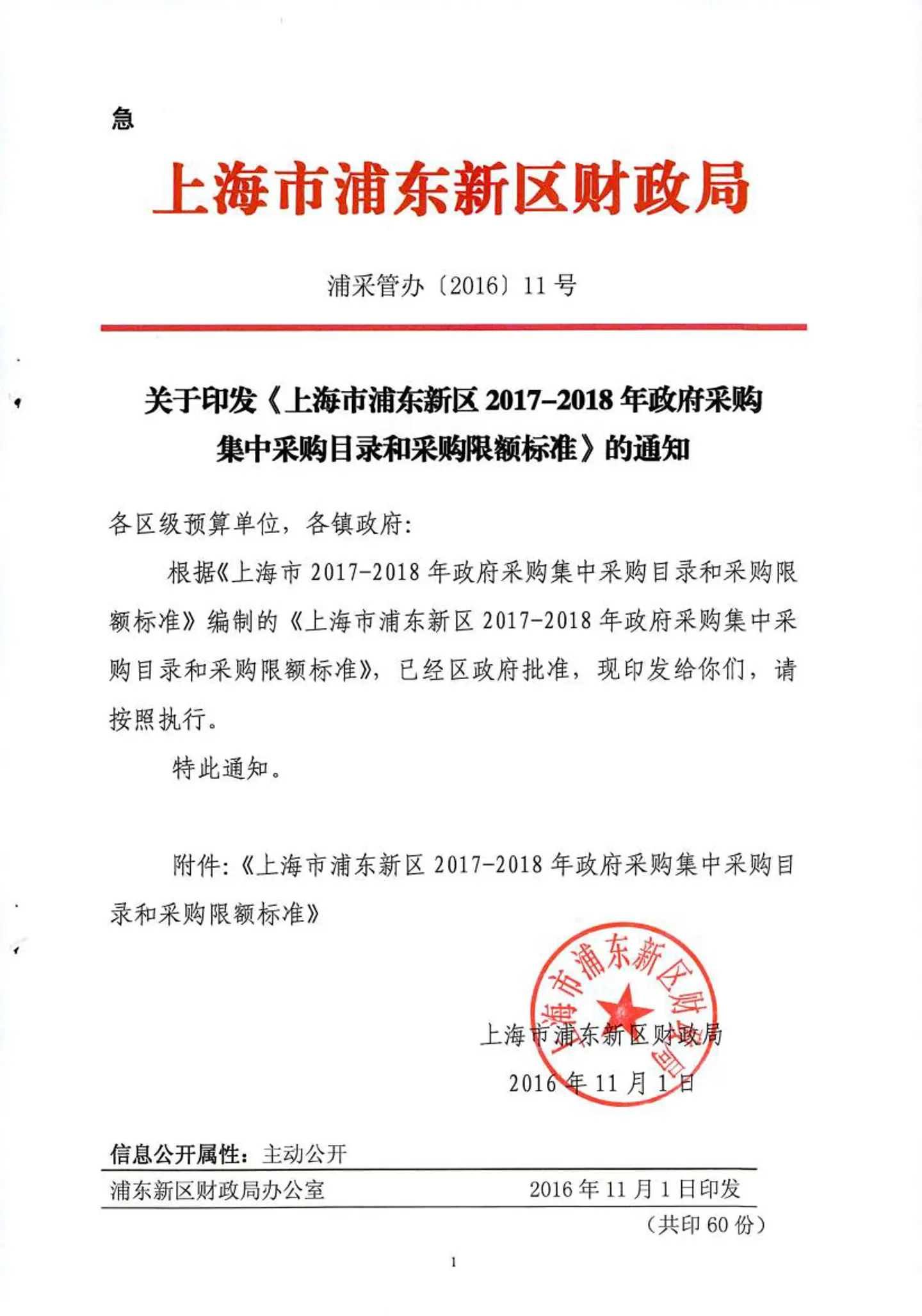 关于印发《上海市浦东新区2017-2018年政府采购集中采购目录和采购限额标准》的通知(浦采管办[2016]11号)