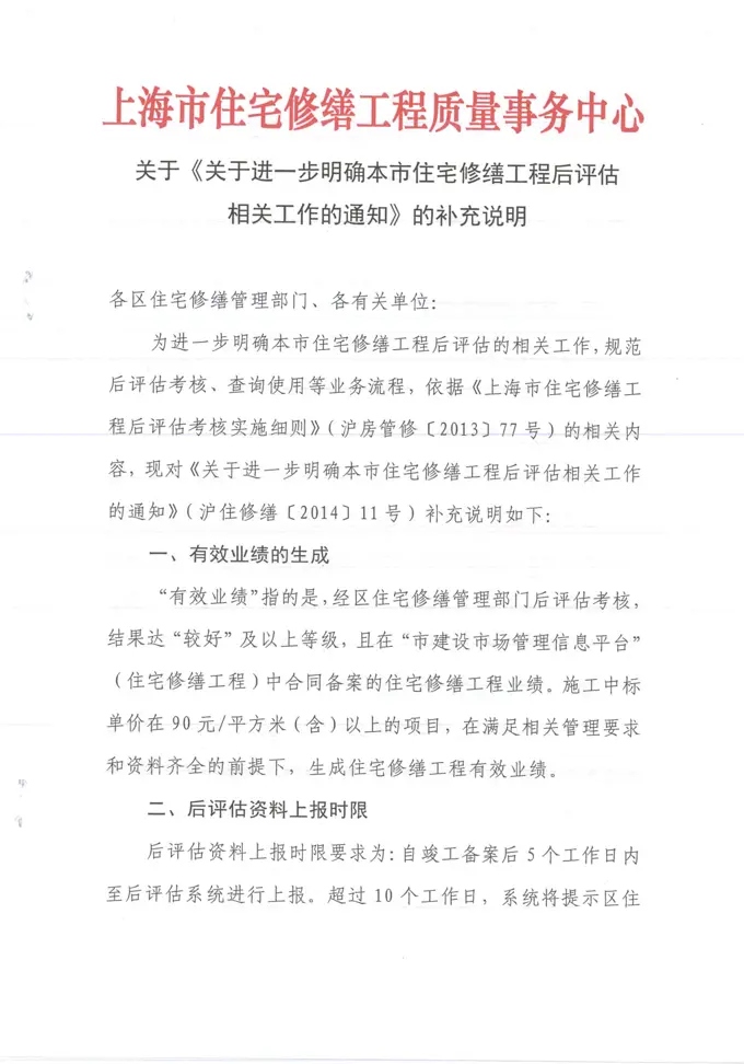 关于《关于进一步明确本市住宅修缮工程后评估相关工作的通知》的补充说明