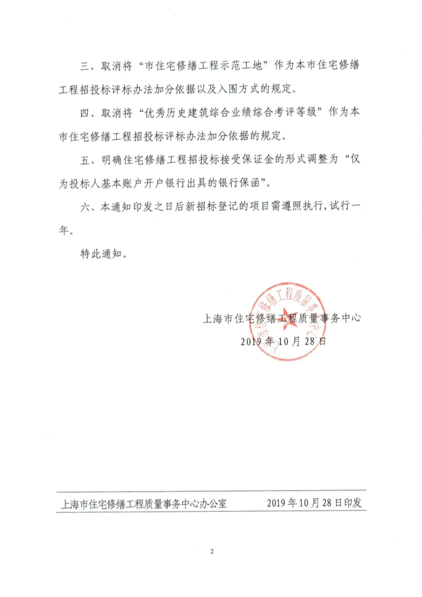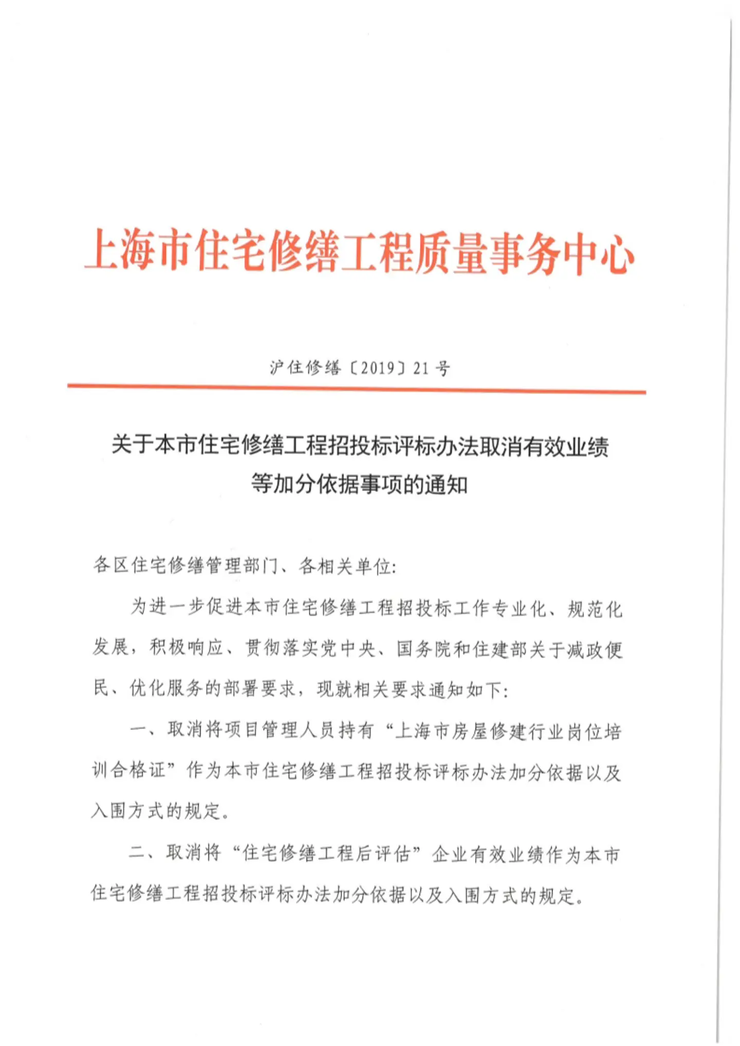 关于本市住宅修缮工程招投标评标办法取消有效业绩等加分依据事项的通知 沪住修缮[2019]21号