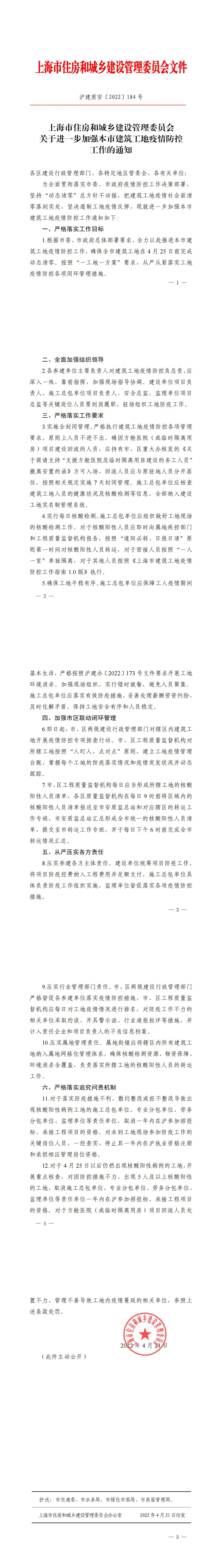 沪建质安〔2022〕184 号《上海市住房和城乡建设管理委员会 关于进一步加强本市建筑工地疫情防控 工作的通知》