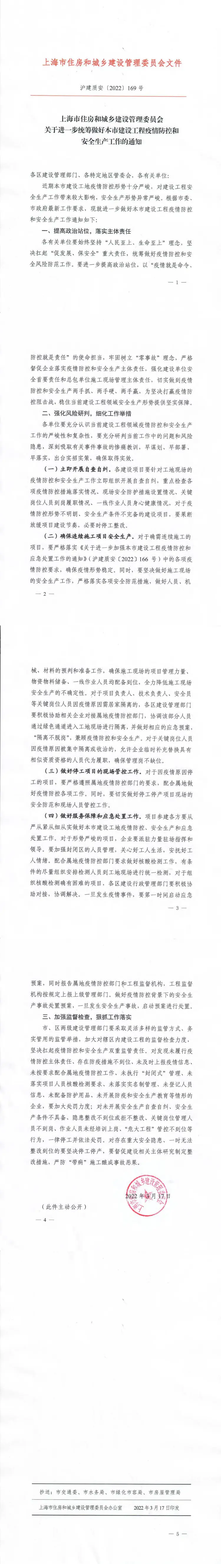 沪建质安【2022】169号《关于进一步统筹做好本市建设工程疫情防控和安全生产工作的通知》