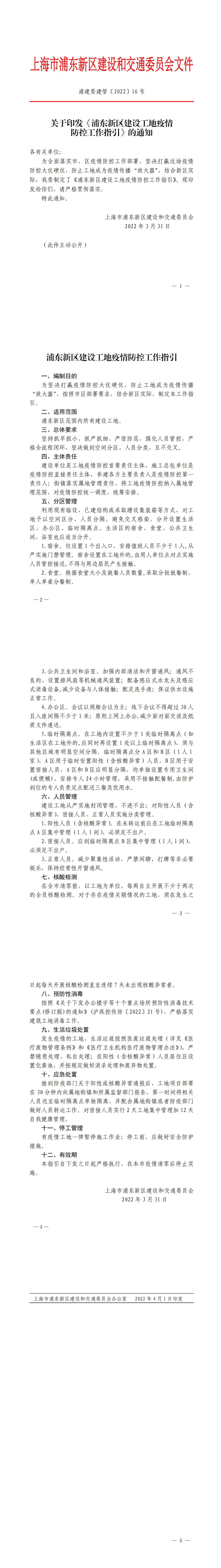 浦建委建管〔2022〕16 号《关于印发《浦东新区建设工地疫情 防控工作指引》的通知》