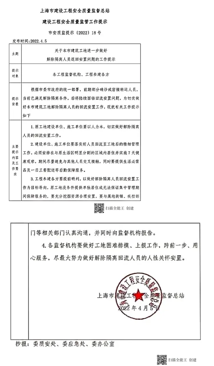 市安质监提示〔2022〕18 号《关于本市建筑工地进一步做好接触隔离人员返回安置问题的工作提示》