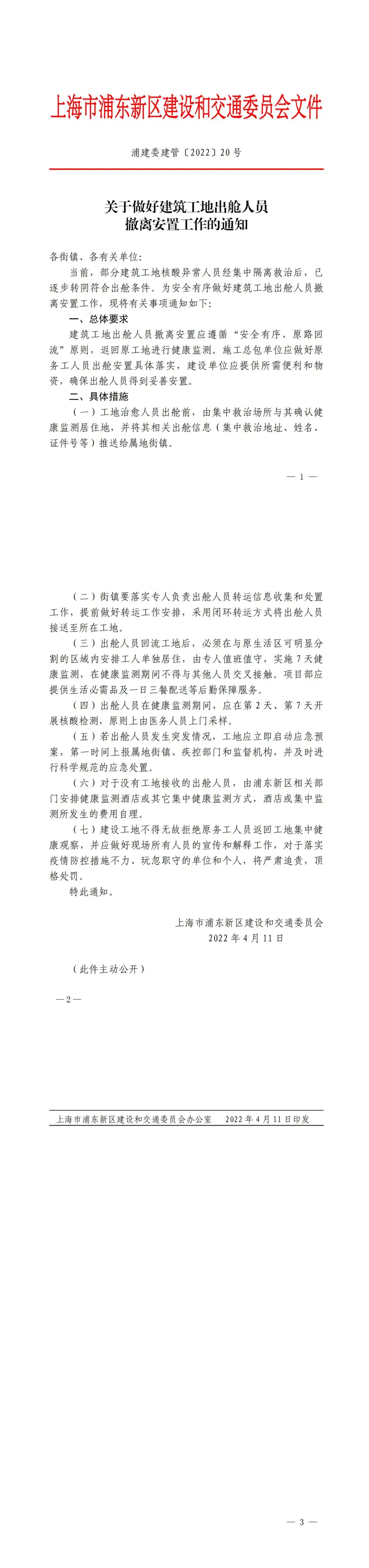 浦建委建管〔2022〕20 号《关于做好建筑工地出舱人员 撤离安置工作的通知》
