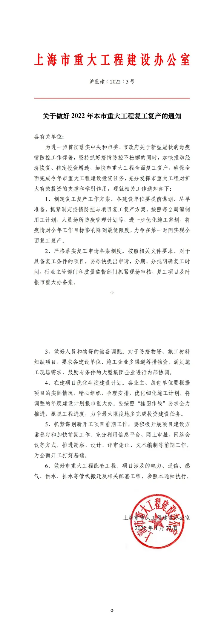 沪重建【2-22】3 号《关于做好 2022 年本市重大工程复工复产的通知》