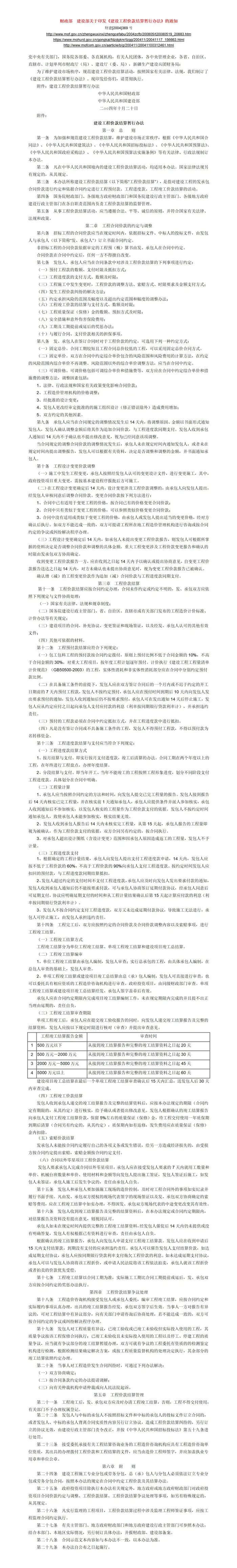 [财政部 建设部] 关于印发《建设工程价款结算暂行办法》的通知【财建[2004]369号】