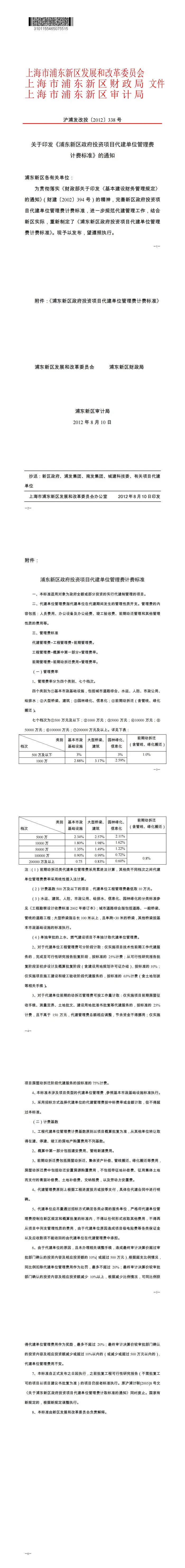 关于印发《浦东新区政府投资项目代建单位管理费计费标准》的通知【沪浦发改投〔2012〕338号】