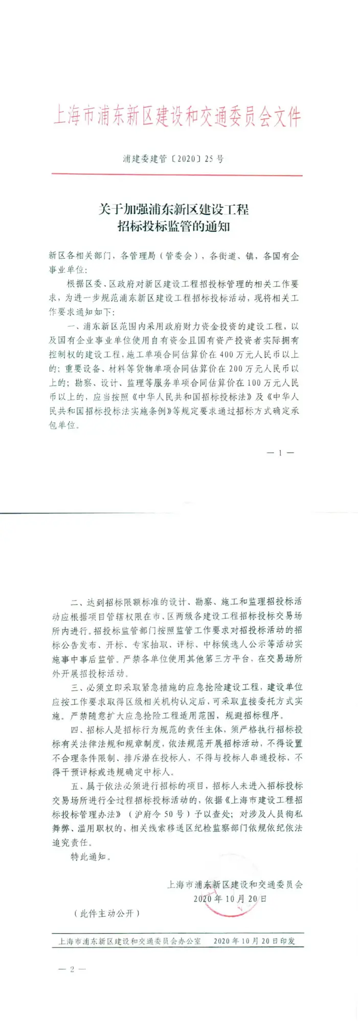关于加强浦东新区建设工程招标投标监管的通知【浦建委建管〔2020〕25号】
