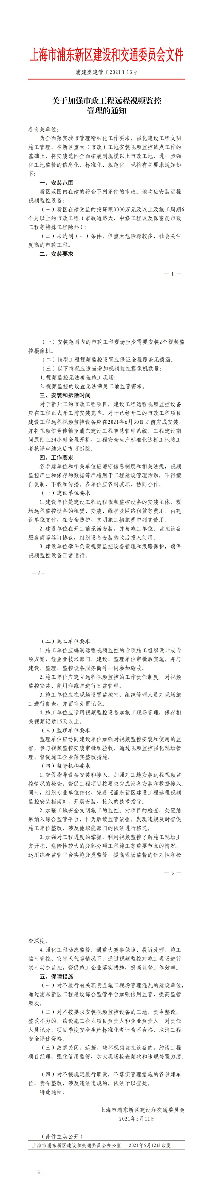 关于加强市政工程远程视频监控管理的通知【浦建委建管〔2021〕13号】