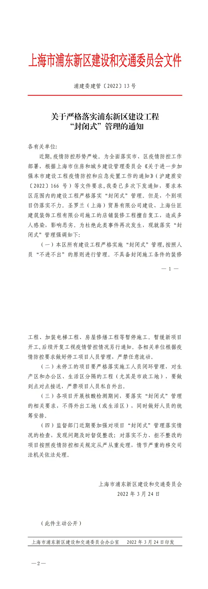 关于切实落实浦东新区建设工程“封闭式”管理的通知【浦建委建管【2022】13号】