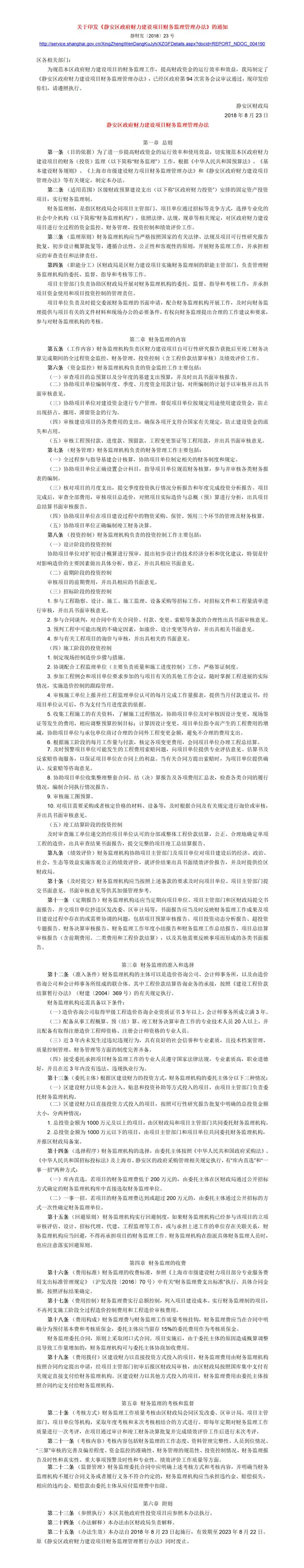 [静安]关于印发《静安区政府财力建设项目财务监理管理办法》的通知【静财发〔2018〕23号】