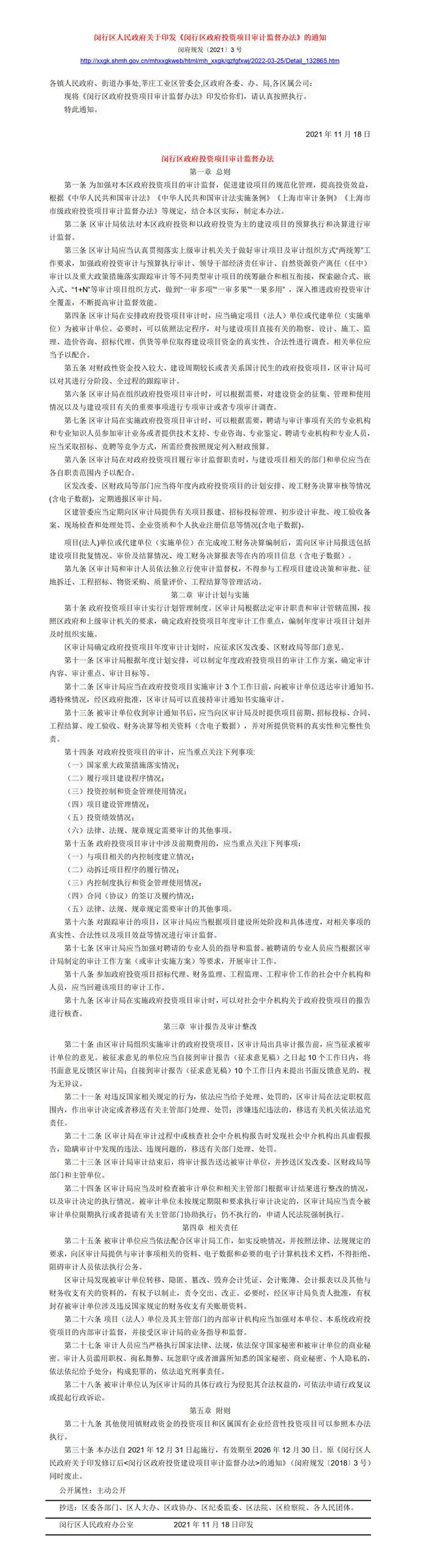 [金山闵行]关于印发《闵行区政府投资项目审计监督办法》的通知【闵府规发〔2021〕3号】