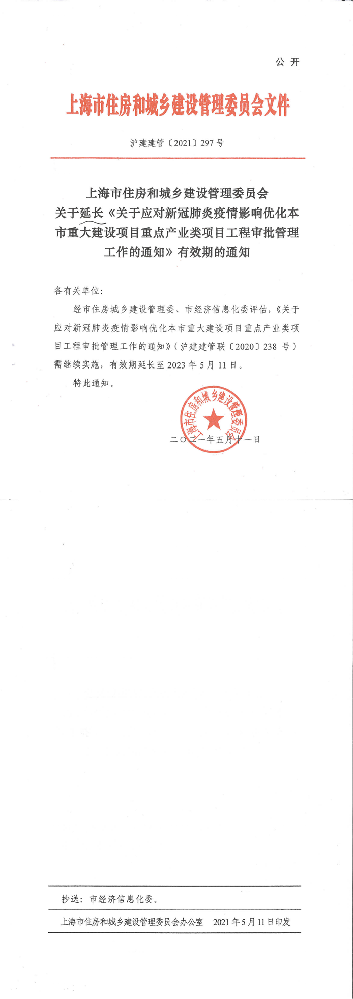 关于延长《关于应对新冠肺炎疫情影响优化本市中大建设项目重点产业类项目工程审批管理工作的通知》有效期的通知(沪建建管[2021]297号)