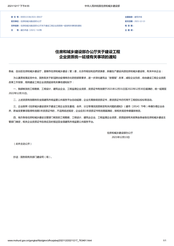 《住房和城乡建设部办公厅关于建设工程企业资质统一延续有关事项的通知》建办市函〔2021〕510号