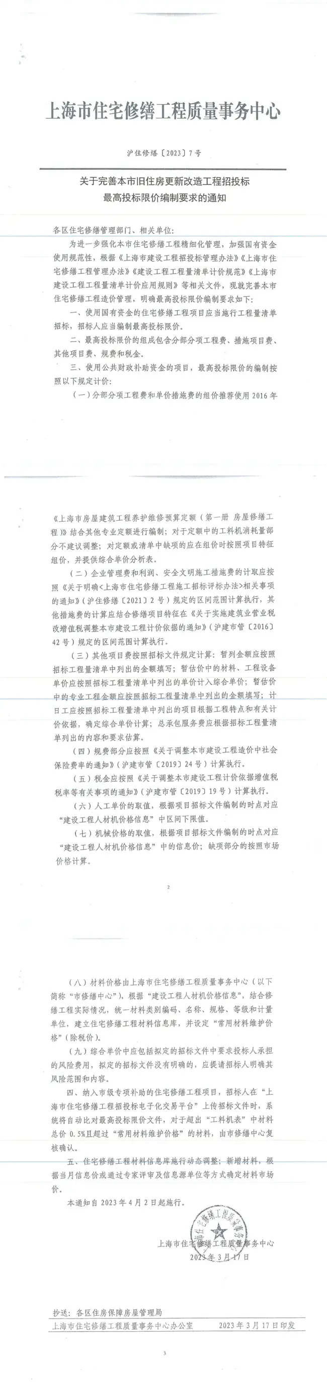 关于完善本市旧住房更新改造工程招投标最高投标限价编制要求的通知【沪住修缮〔2023〕7 号】