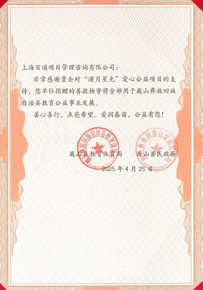 近日,我司積極參與云南大理巍山縣教育體育局和巍山縣民政局舉辦的“浦月星光”愛心公益項目,依托“浦東—巍山”東西部結對幫扶平臺,向當地山區留守兒童定向捐助5萬元善款,用于巍山彝族回族自治縣教育公益事業發展,收到巍山彝族回族自治縣教育體育局頒發的“愛心企業”榮譽稱號。